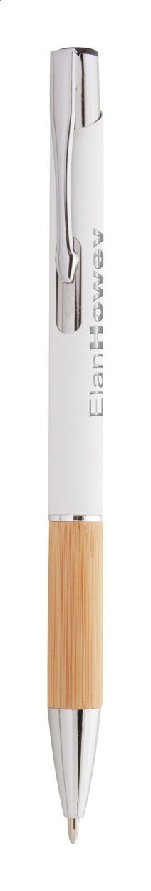 Penna a sfera in carta riciclata con clip in compensato personalizzabile e refill blu. La clip è realizzabile con forma esclusiva - dimensione massima: 25×35 mm. Il costo comprende l'incisione del logo sulla clip. MOQ: 100 pezzi.