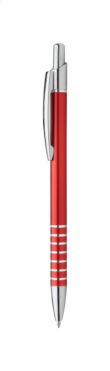 Penna a sfera in alluminio con decorazione incisa ad anelli, clip e puntale cromati, refill blu.