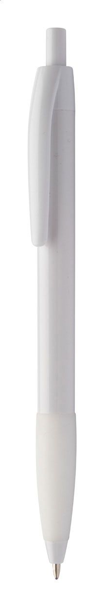 Penna a sfera in plastica con corpo bianco, impugnatura in colorata e parti cromate lucide. Fornita con refill blu.