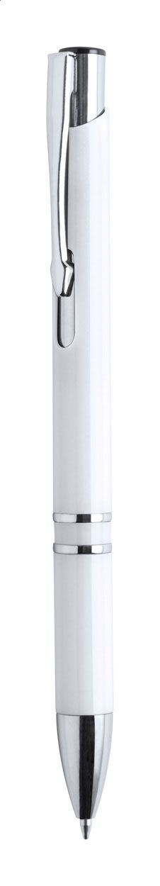 Penna a sfera in plastica bianca con particolari colorati e puntale cromato. Fornita con refill blu.