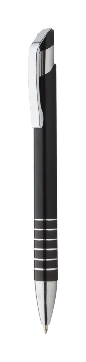 Penna a sfera in plastica con finitura metallizzata, impugnatura in alluminio e clip in metallo. Fornita con refill blu.