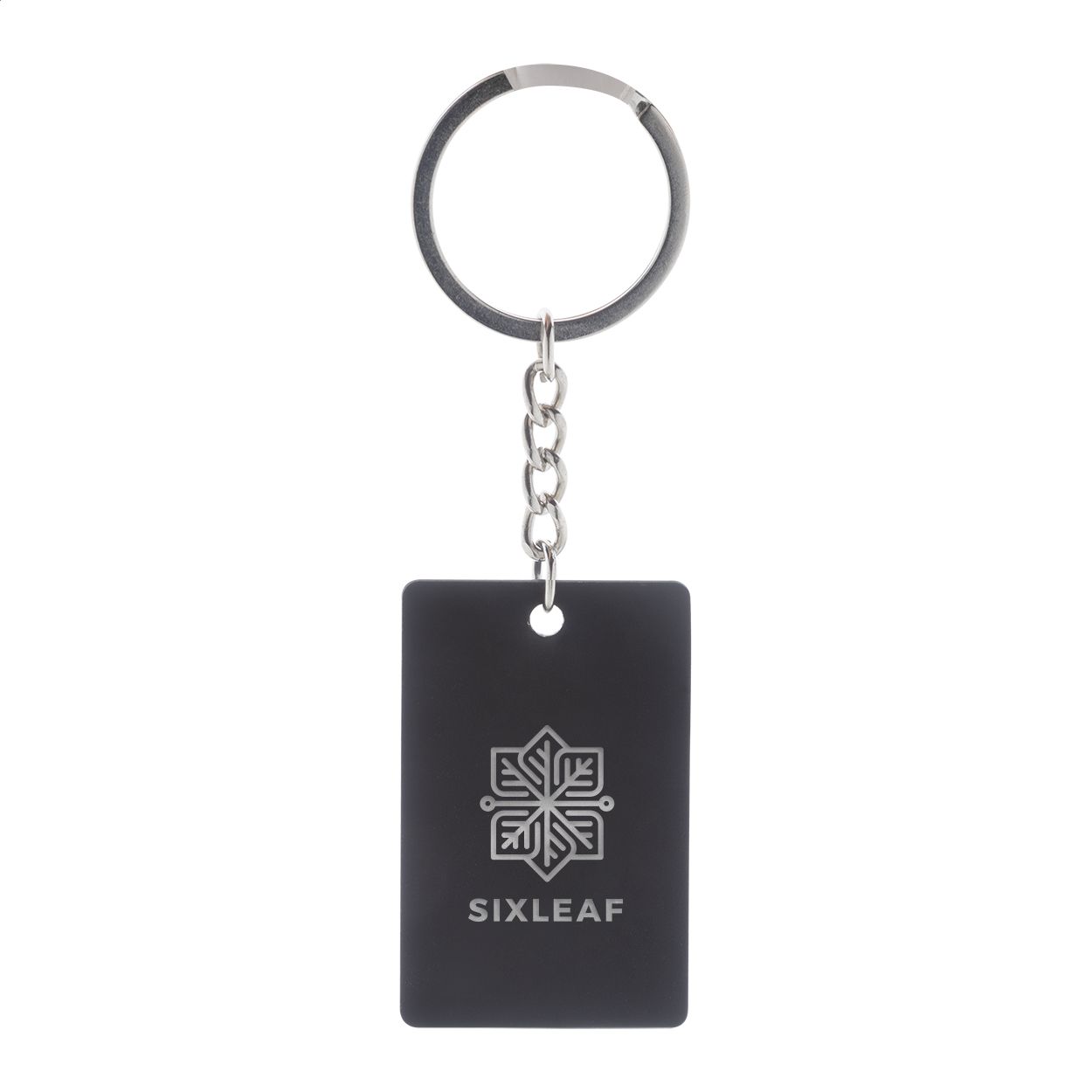 Portachiavi in acciaio riciclato a forma di rettangolo con finitura gommata. Trattamento speciale che permette l'incisione laser a specchio.