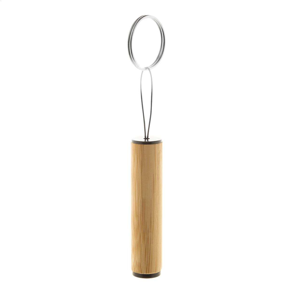 Mini torcia in bambù con 1 LED e portachiavi in metallo. Completa di batteria a bottone.