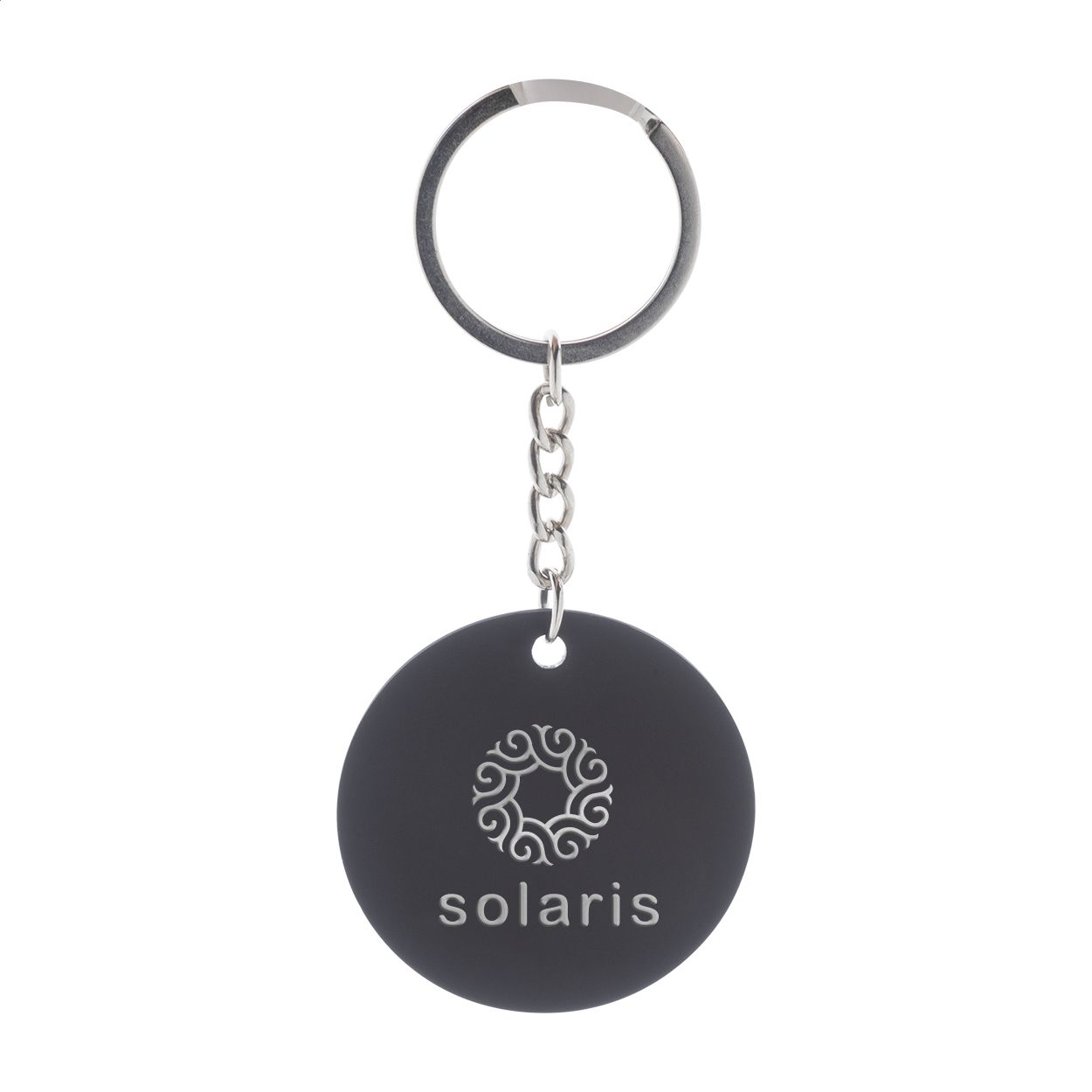 Portachiavi in acciaio riciclato di forma rotonda con finitura gommata. Trattamento speciale che permette l'incisione laser a specchio.