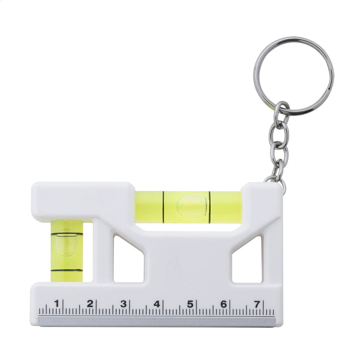 Portachiavi multifunzione in ABS riciclato con anello in metallo, righello, magnete e doppia livella.