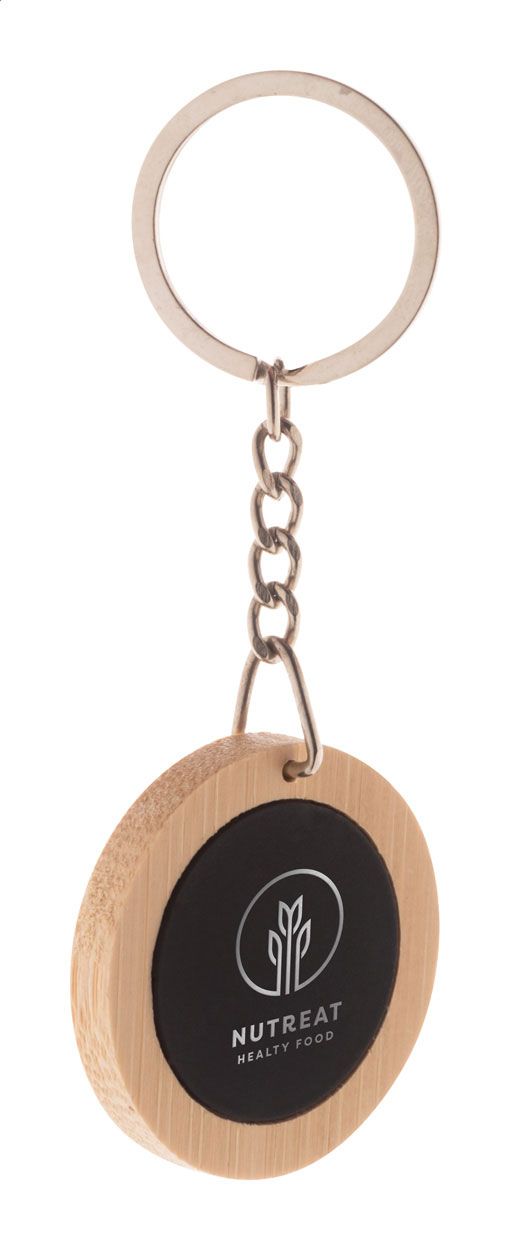 Portachiavi in metallo di forma rotonda con inserto in bambù. In confezione di carta kraft.