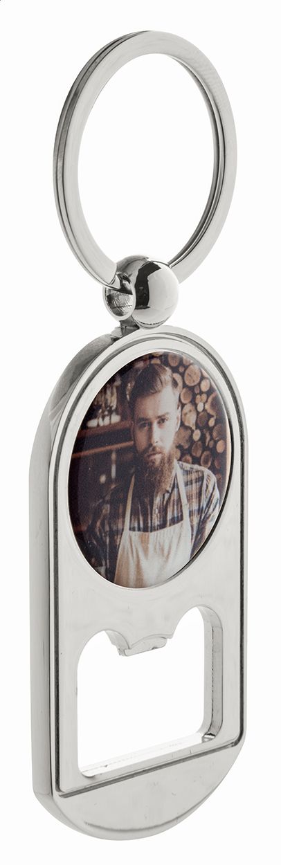 Portachiavi con apribottiglie in metallo e personalizzazione in resina epossidica. In scatola regalo nera. Il prezzo include la stampa in resina epossidica. MOQ: 100 pezzi.