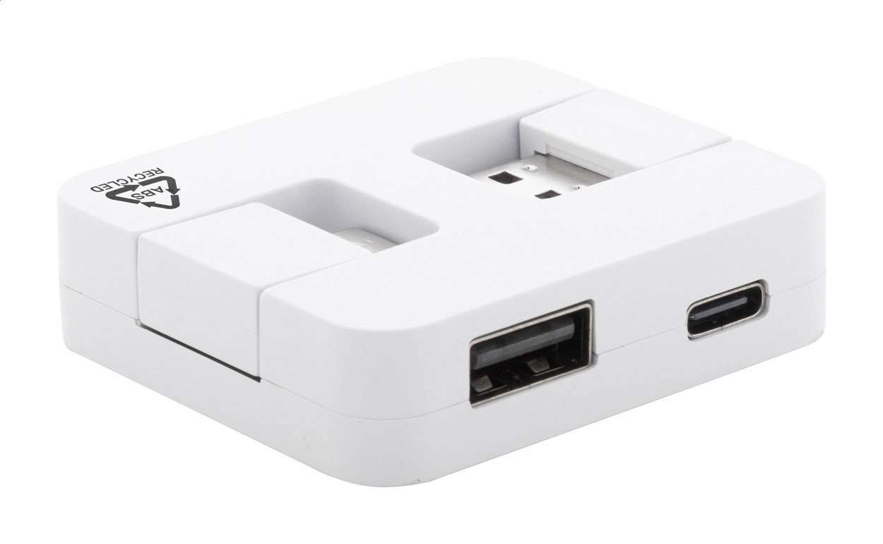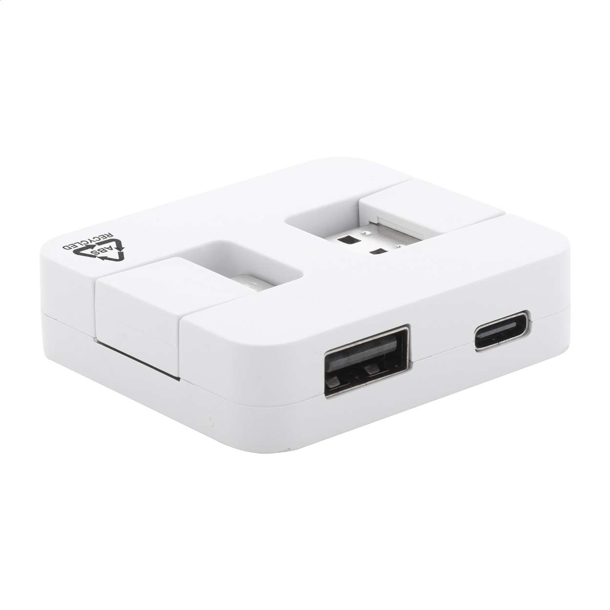 Hub USB 2.0 in plastica ABS riciclata con 2 porte USB, 2 porte USB-C e connettori USB e USB-C ripiegabili.