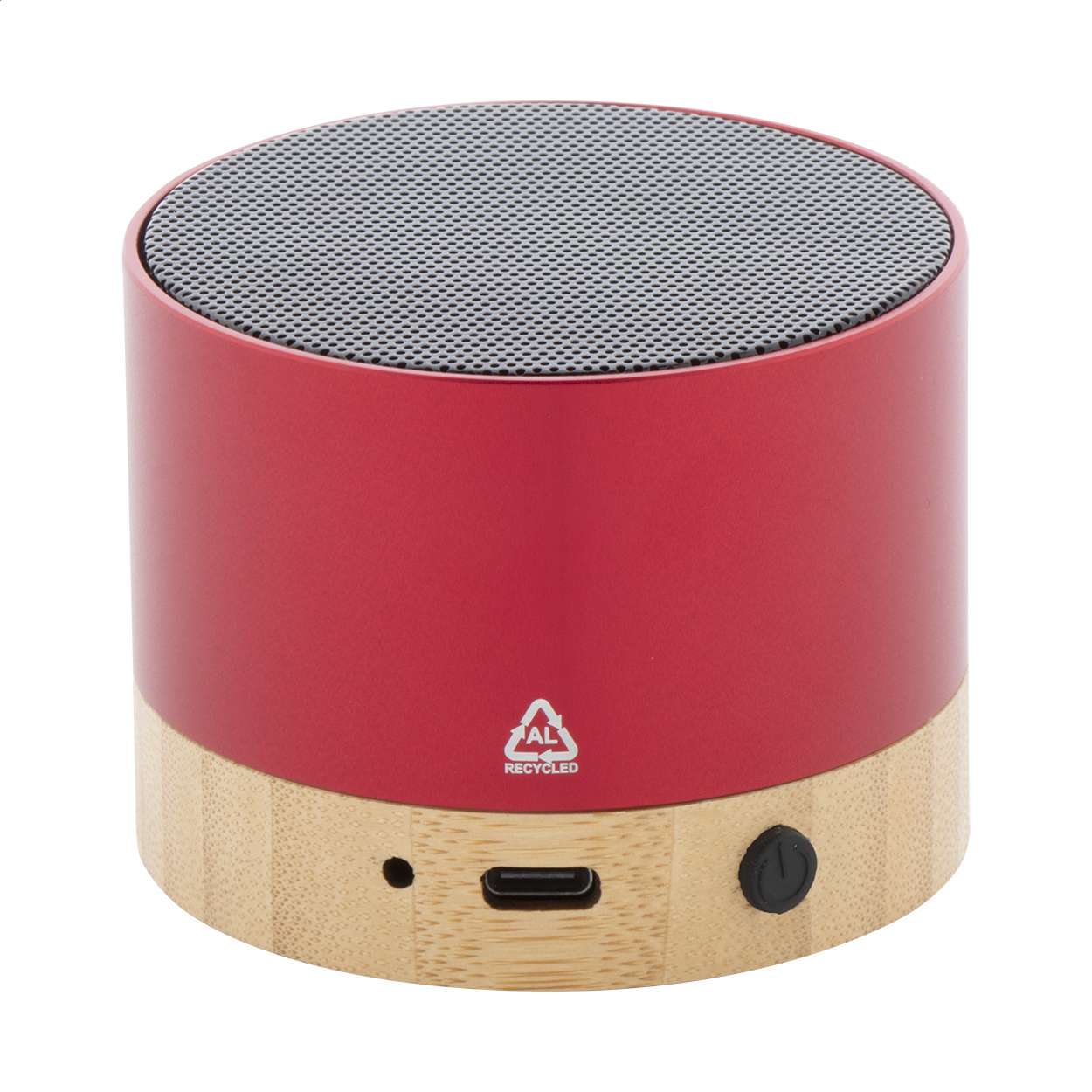 Cassa wireless in alluminio riciclato con base in bambù. Con funzione di chiamata in vivavoce e batteria ricaricabile integrata. Cavo di ricarica USB incluso.