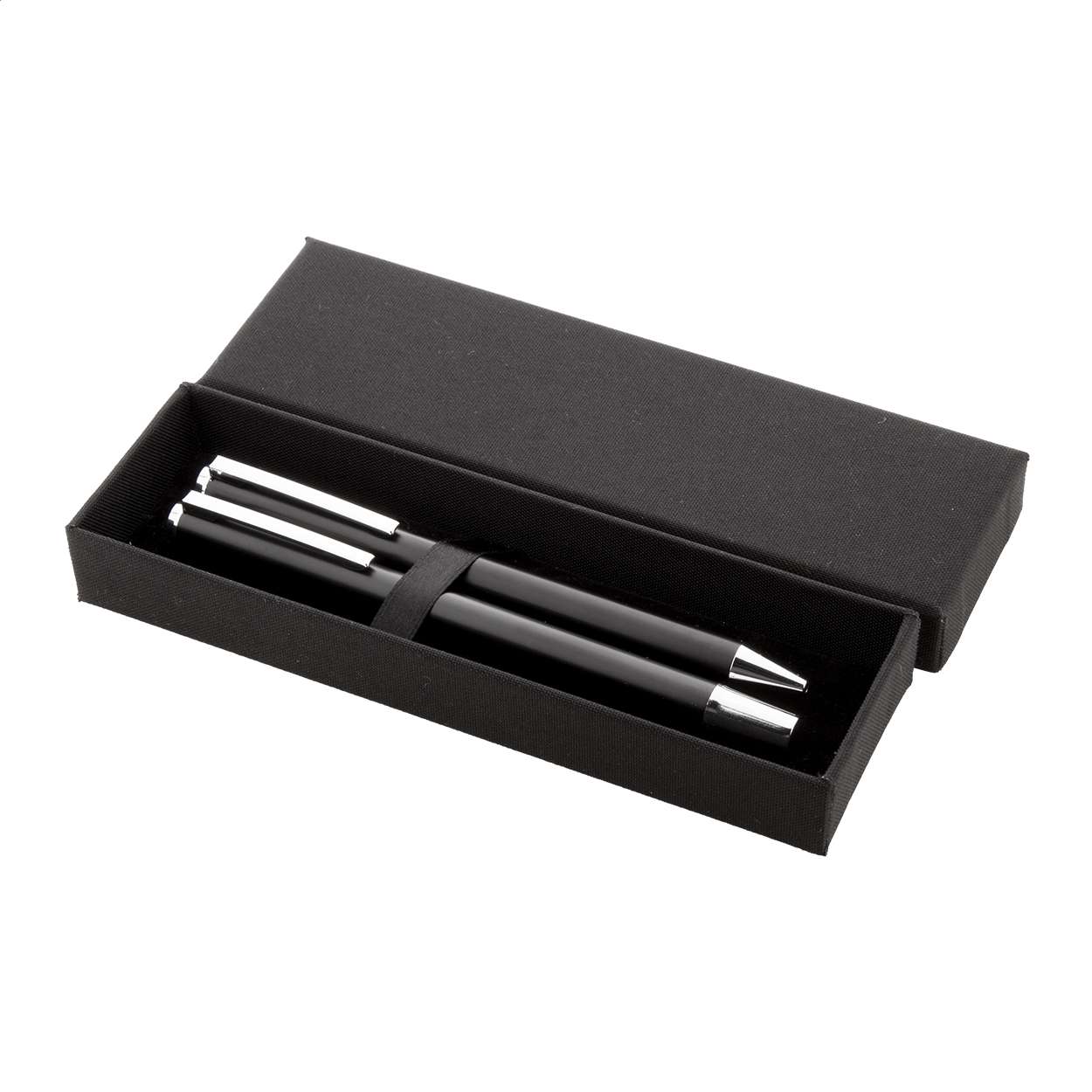 Set di penne in alluminio riciclato composto da una penna roller ed una penna a sfera in confezione regalo di cartoncino nero. Con refill blu.