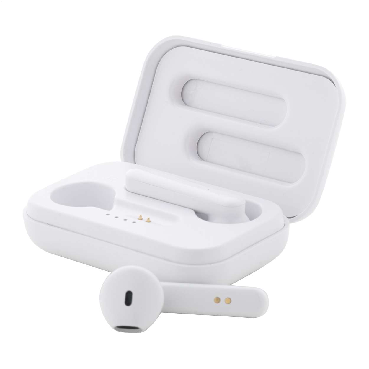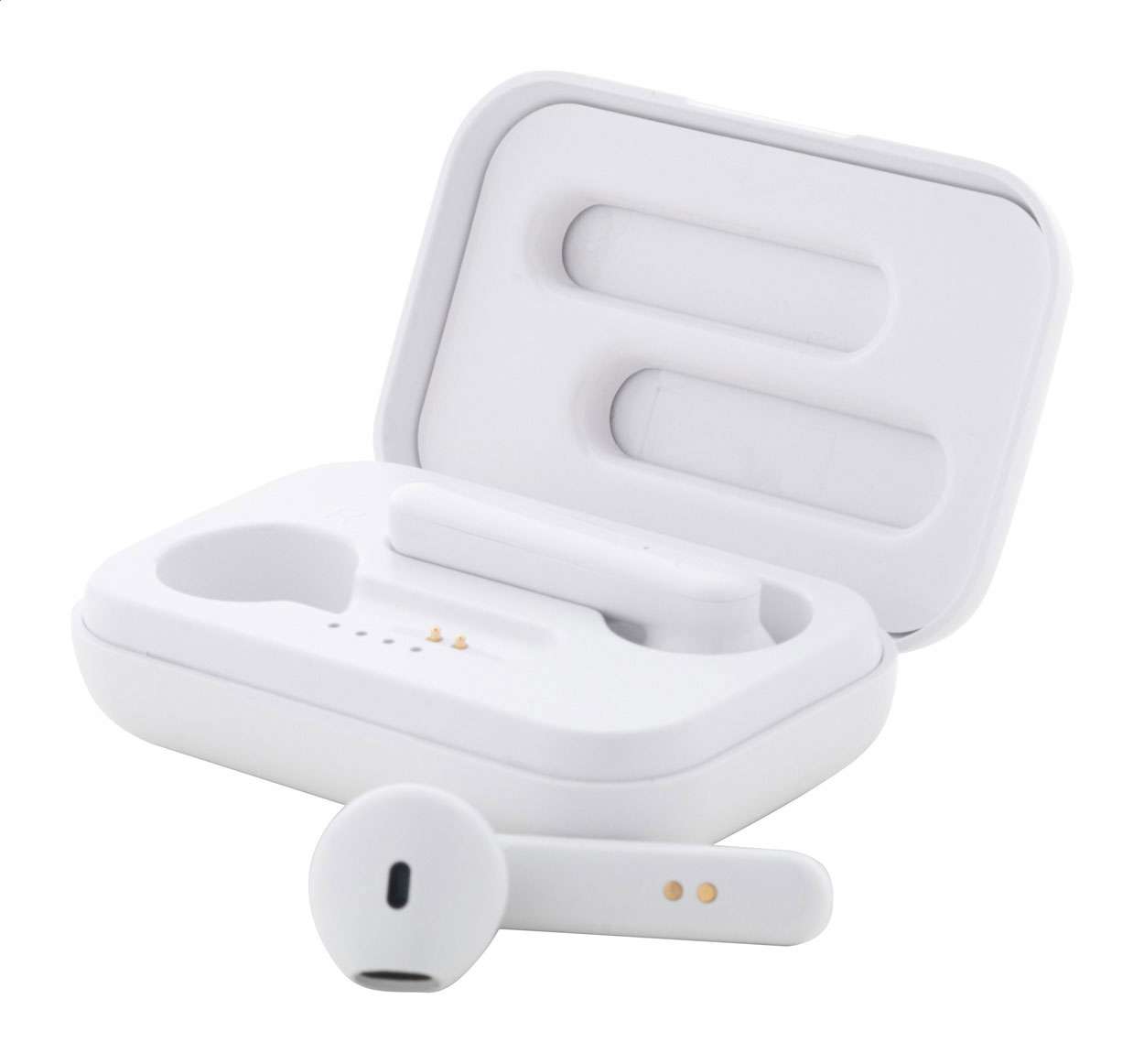 Auricolari stereo true wireless (TWS) in plastica ABS riciclata con funzione di chiamata in vivavoce, in custodia di plastica con batteria da 400 mAh. Incluso cavo di ricarica USB.