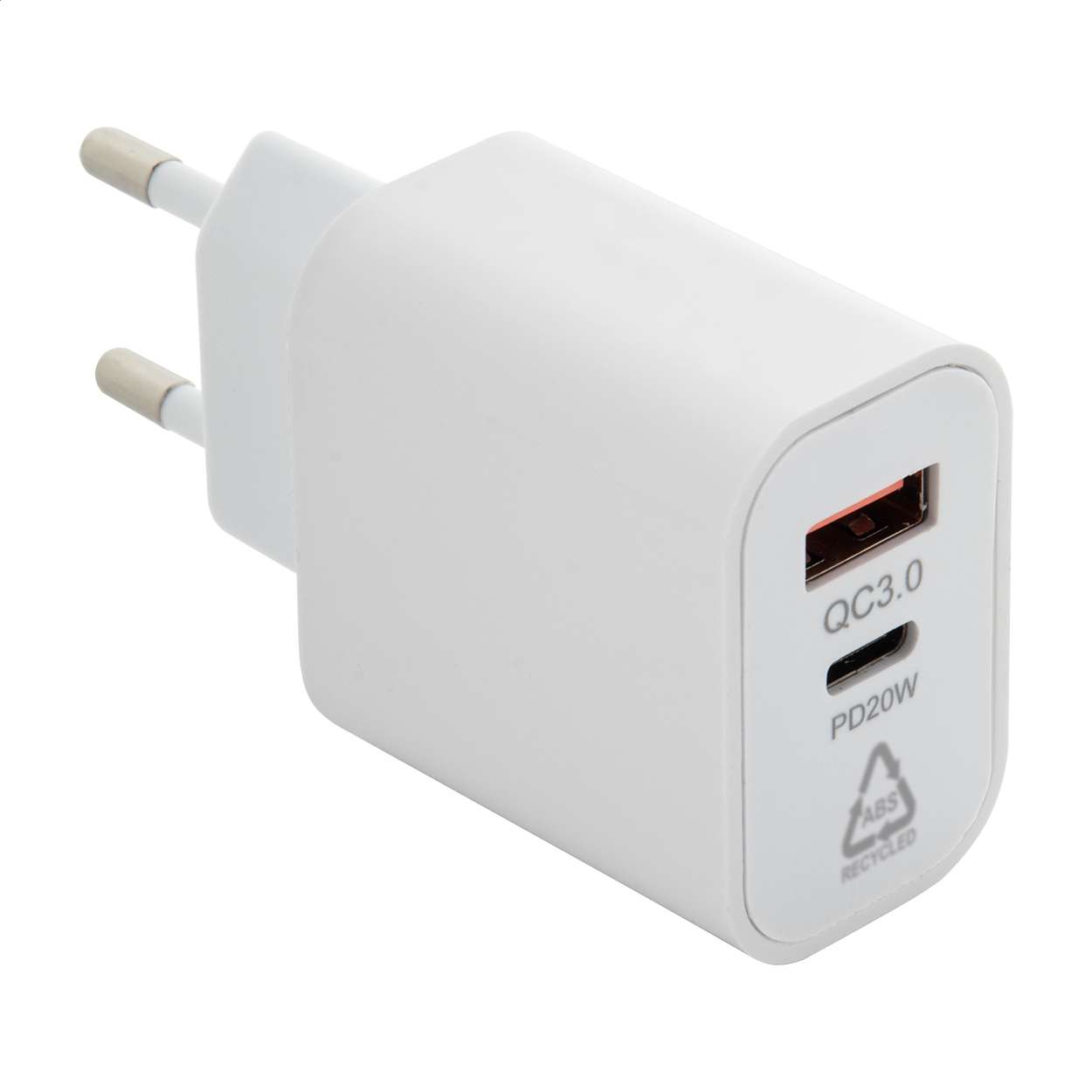 Caricabatterie USB da parete a ricarica rapida in ABS riciclato con 1 porta USB e 1 porta USB-C. Supporta la tecnologia di ricarica rapida (PD20W / QC3.0). Con spina europea a 2 poli