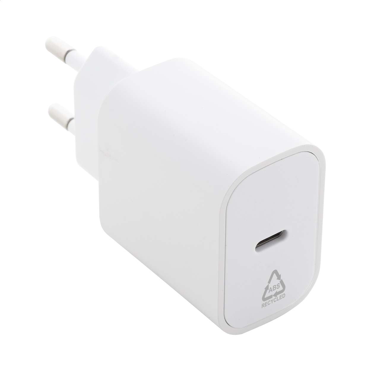 Caricatore da parete USB a ricarica rapida in ABS riciclato 1 porta USB-C, con spina europea a 2 poli e tecnologia di ricarica rapida (PD20W / QC3.0).