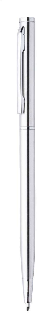 Penna a sfera in acciaio riciclato con meccanismo di apertura a rotazione e componenti cromate. Fornita con refill blu.