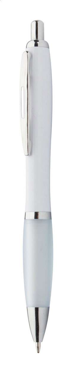 Penna a sfera in plastica ABS riciclata con refill blu, fusto bianco, impugnatura colorata e parti cromate.