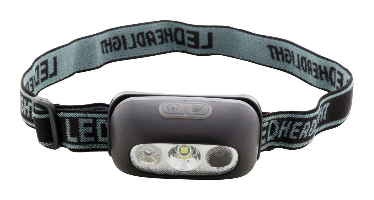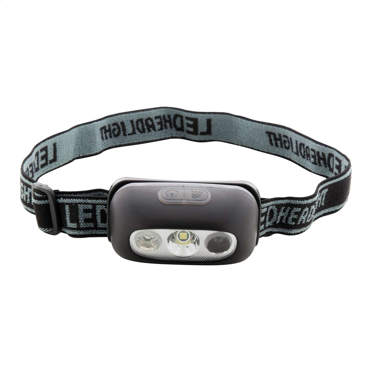 Lampada frontale in plastica con batteria ricaricabile USB integrata (400 mAh) e fascia regolabile. Dispone di luce COB ad alta potenza e doppio sensore di movimento. Modalità di luce elevata, bassa e in risposta al movimento. Fornita con cavo di ricarica USB.