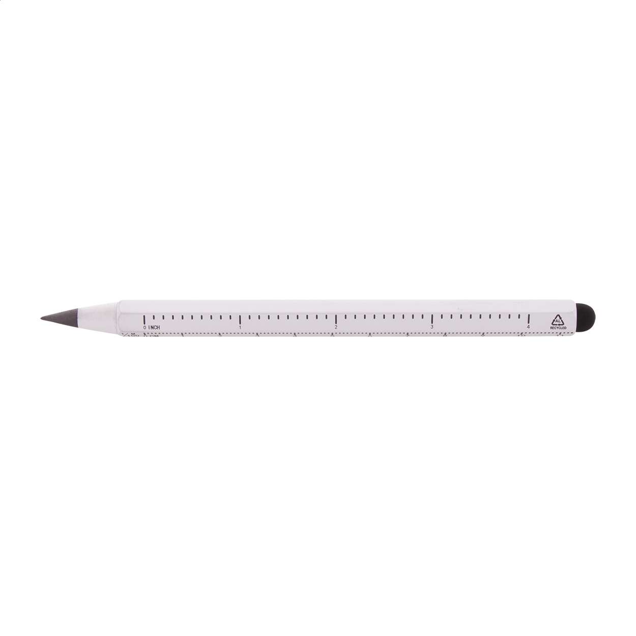 Penna in alluminio riciclato senza inchiostro di lunga durata con punta in lega metallica che ossida la carta e gommino capacitivo. Con fusto esagonale che integra righello da 11 cm e da 4 pollici. Questa penna scrive come una matita ed è anche cancellabile.