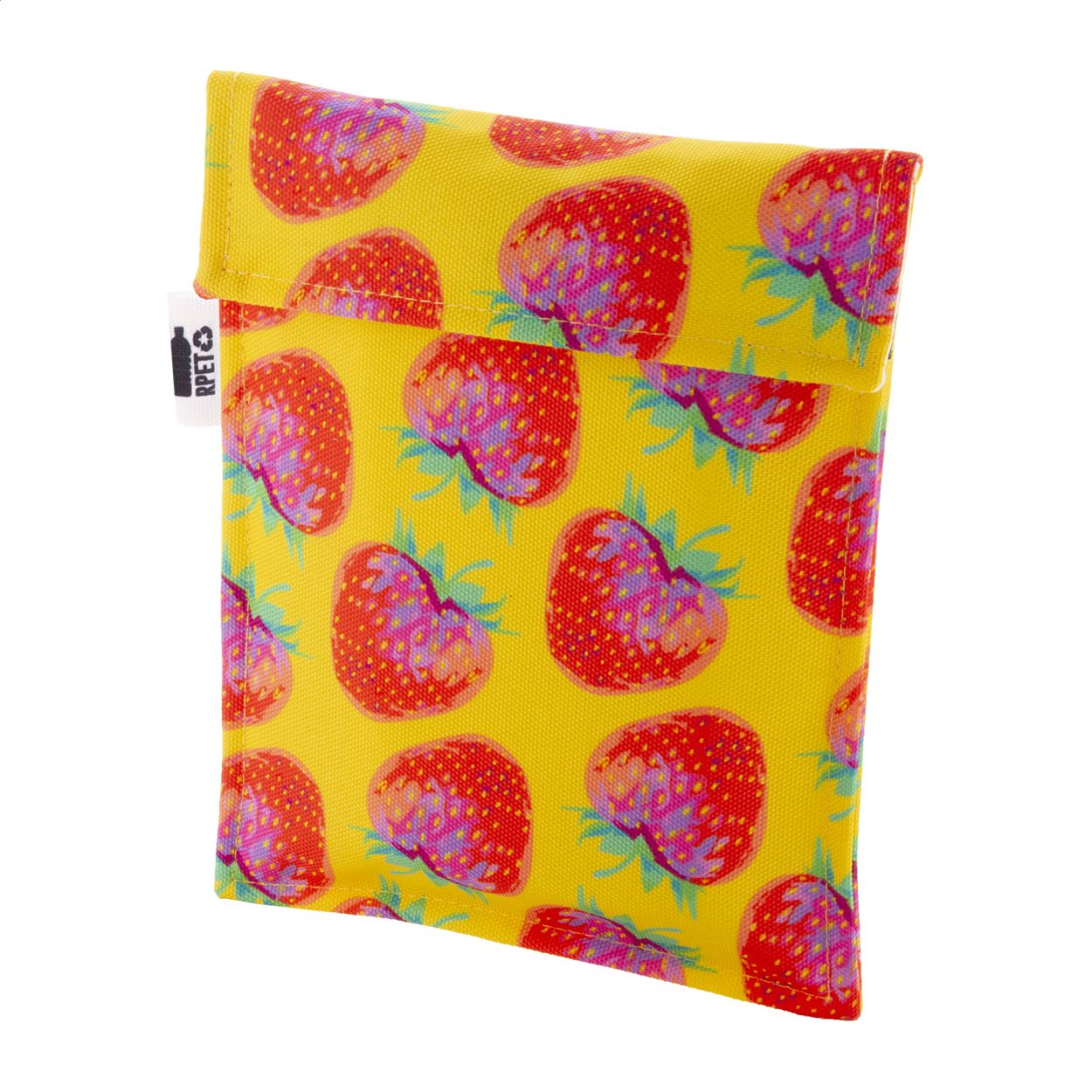 Porta merenda riutilizzabile, in poliestere 600D RPET, chiusura a velcro e resistente fodera impermeabile. Ideale per contenere snack o sandwich. Personalizzazione con grafica stampata in sublimazione su tutta la superficie. MOQ: 25 pezzi.