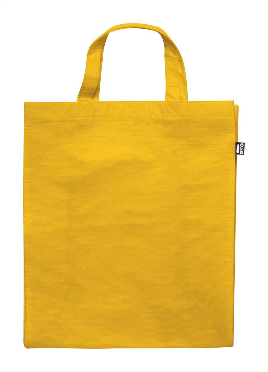 Borsa per la spesa in poliestere RPET laminato da 110 g/m², con soffietto, manici corti ed etichetta RPET.
