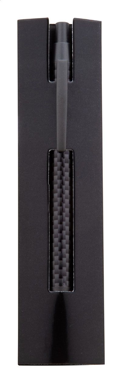 Penna a sfera in metallo e corpo con decorazione simil carbonio, in custodia di cartoncino nero. Con refill blu.