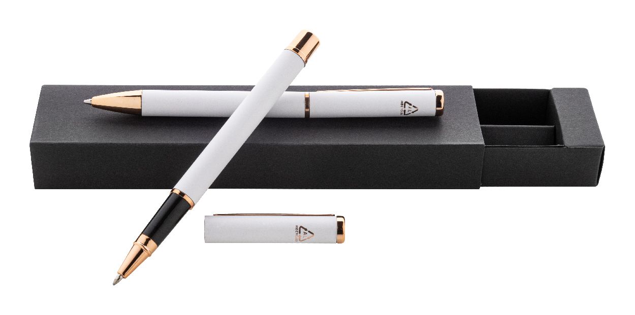 Set di penne in alluminio riciclato composto da penna a sfera e penna roller con finitura gommata e dettagli in color oro rosa e refill blu. Lo speciale rivestimento permette incisioni a laser a specchio nel colore oro rosa. Set fornito in confezione regalo di cartoncino nero.