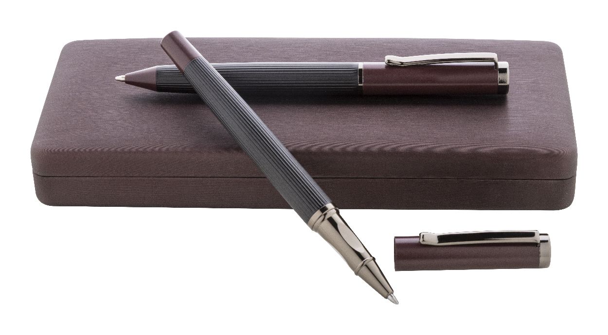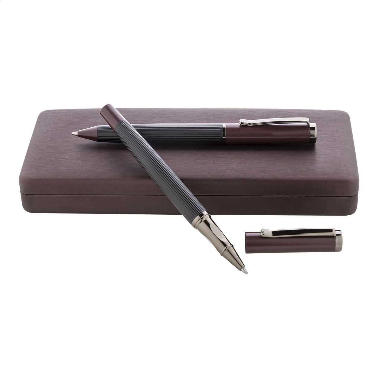 Elegante set composto da penna a sfera e penna roller in metallo con dettagli color canna di fucile e refill blu. Set fornito in confezione regalo in colore coordinato. Prodotto a marchio André Philippe.