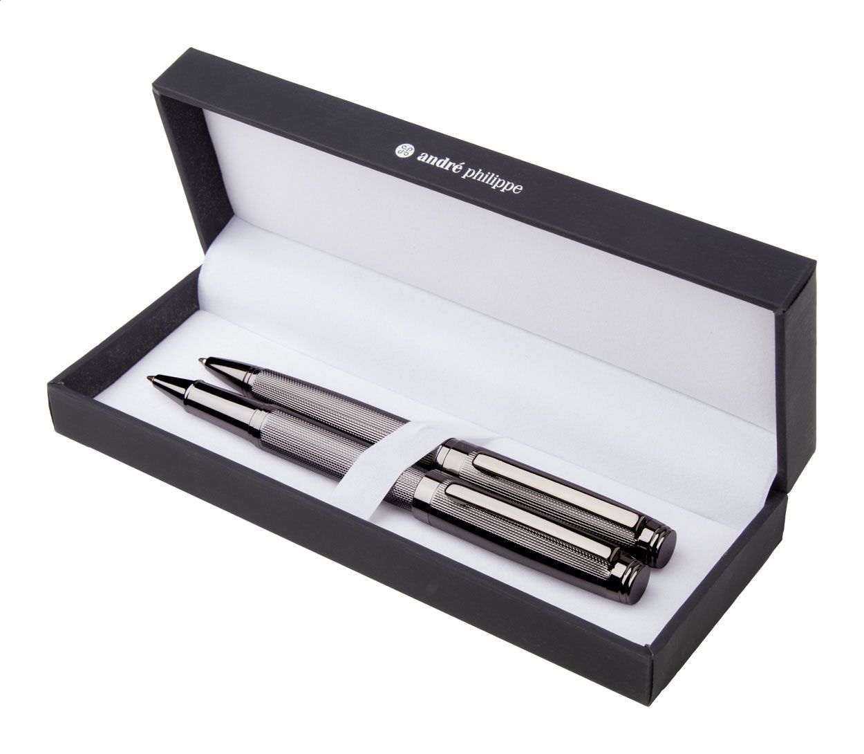 Elegante set composto da una penna a sfera ed una penna roller in metallo con fusto decorato. In confezione regalo nera e refill blu. Prodotto a marchio André Philippe.