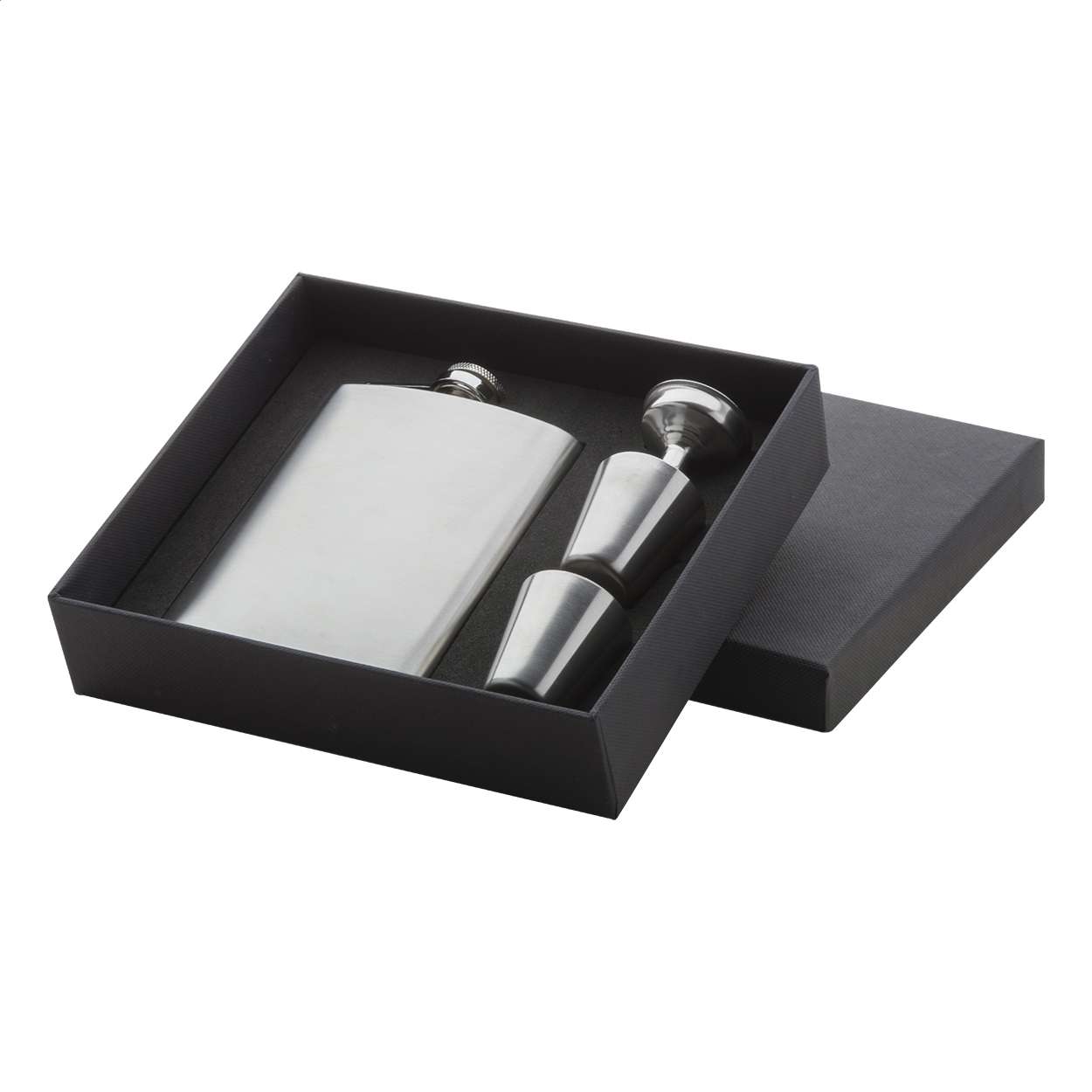 Fiaschetta in acciaio inossidabile 230 ml. con 2 bicchierini e un imbuto. In confezione regalo nera.