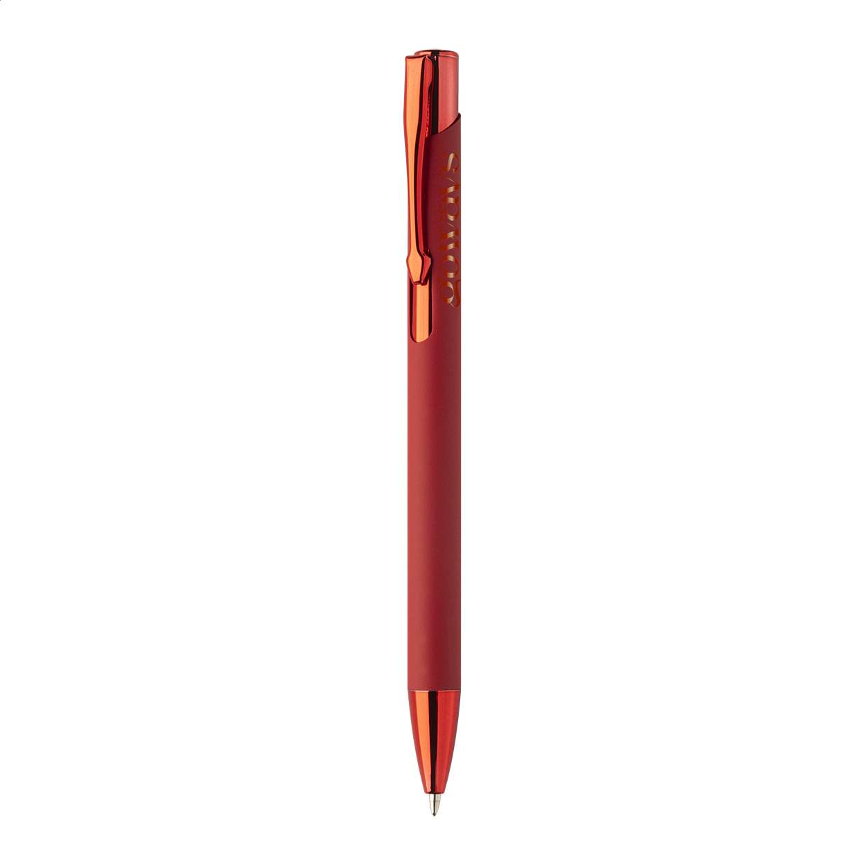Penna a sfera in alluminio riciclato con corpo gommato, parti colorate con finitura metallica lucida e refill blu. Lo speciale rivestimento permette l'incisione a specchio in colore coordinato delle parti metalliche.