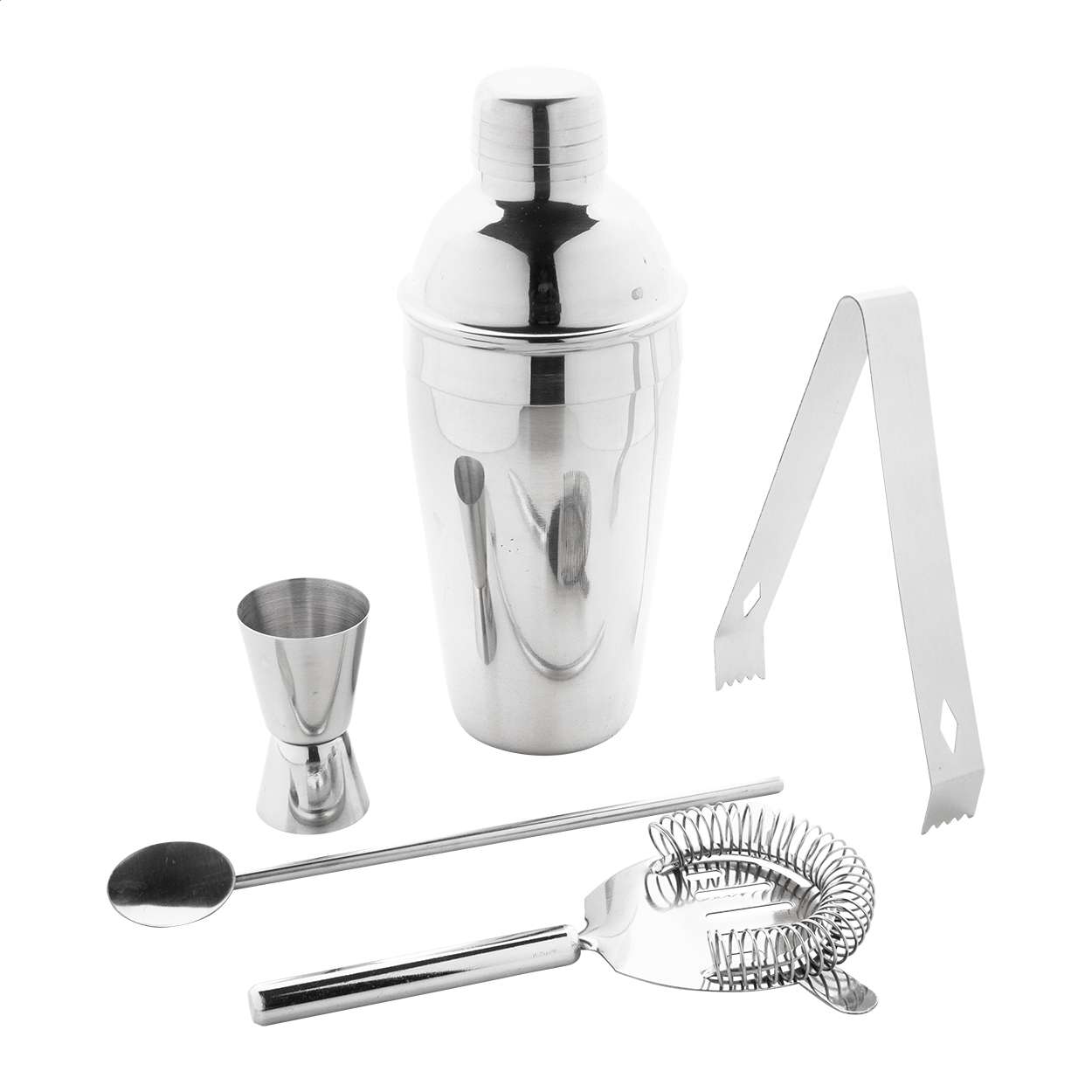 Set da cocktail composto da 5 pezzi in acciaio contenuti in una confezione di cartoncino kraft.Il set comprende: uno shaker per cocktail (550 ml), un jigger, un colino, un cucchiaio da bar e una pinza per il ghiaccio.