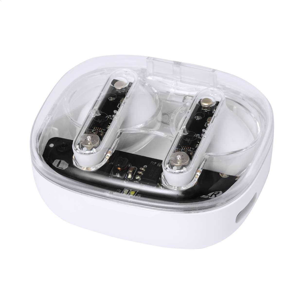 Auricolari stereo true wireless (TWS) semitrasparenti con componenti elettronici visibili e funzione di chiamata in vivavoce. In custodia di plastica semitrasparente. Incluso cavo di ricarica USB.