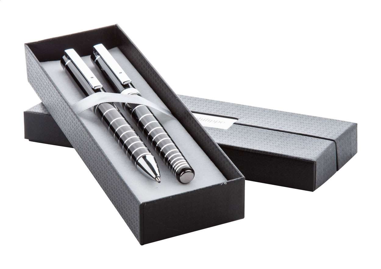 Set di penne in alluminio André Philippe, composto da una penna a sfera ed una penna roller con corpo lucido e decorazione ad anelli cromati. Fornito in confezione regalo e refill blu.