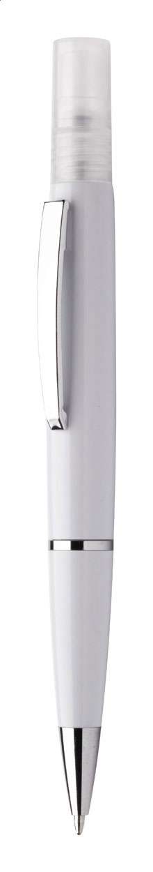 Penna a sfera in plastica con refill blu e spray igienizzante sulla parte superiore. Capacità: 3 ml. Fornita senza liquido disinfettante.