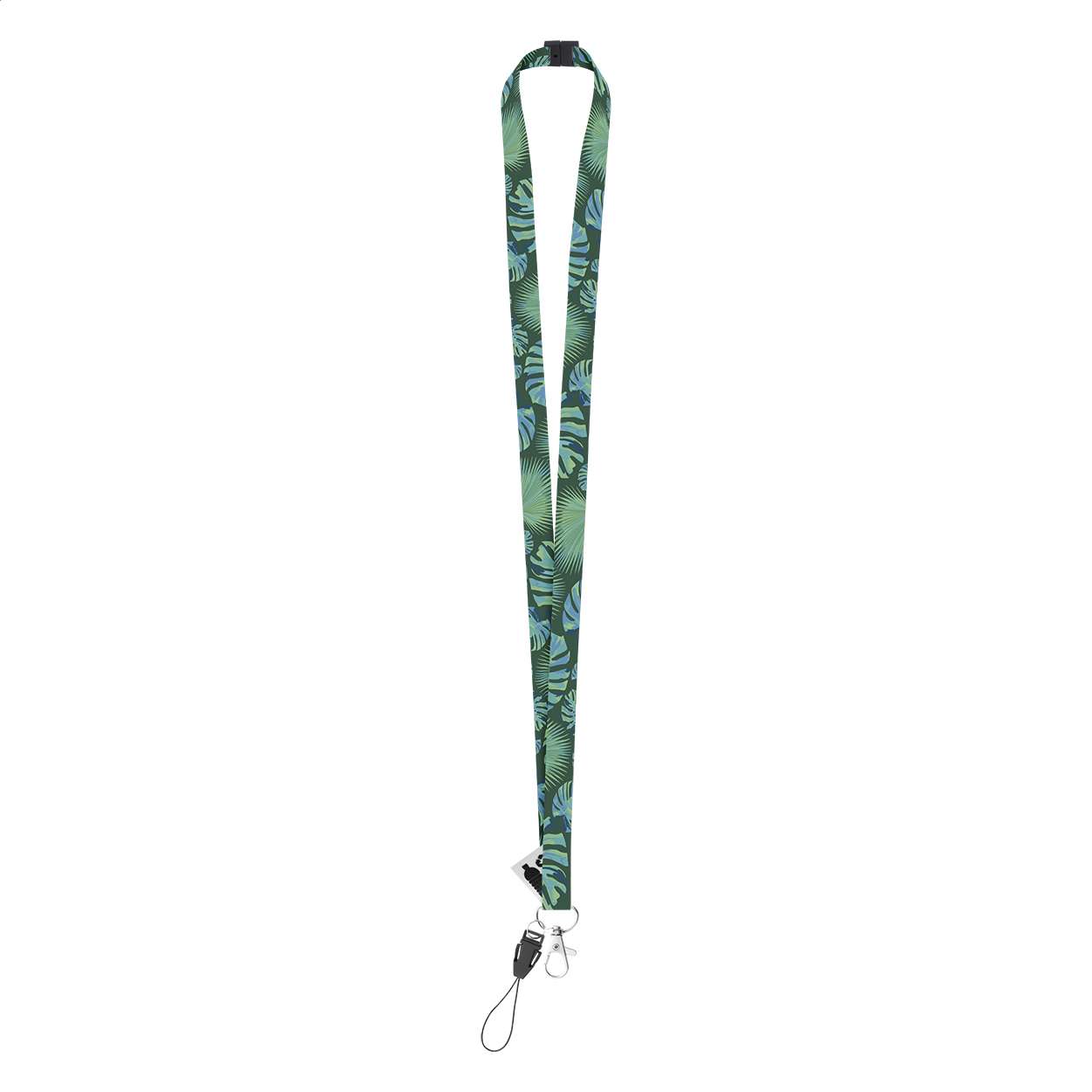 Lanyard in RPET da 15mm personalizzabile, con moschettone in metallo, cordino per cellulare e chiusura di sicurezza, stampa in sublimazione su entrambi i lati. MOQ: 100pz