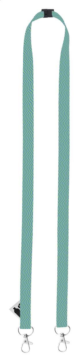 Lanyard in RPET da 15mm personalizzabile, con 2 moschettoni in metallo e chiusura di sicurezza, stampa in sublimazione su entrambi i lati. MOQ: 100pz.