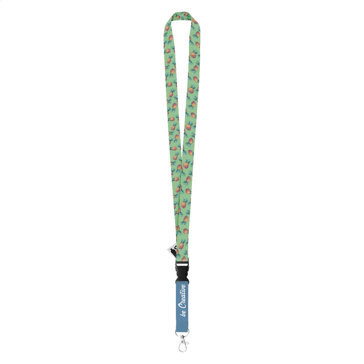 Lanyard in RPET personalizzabile, con moschettone in metallo staccabile, stampa in sublimazione su entrambi i lati. MOQ: 100pz.