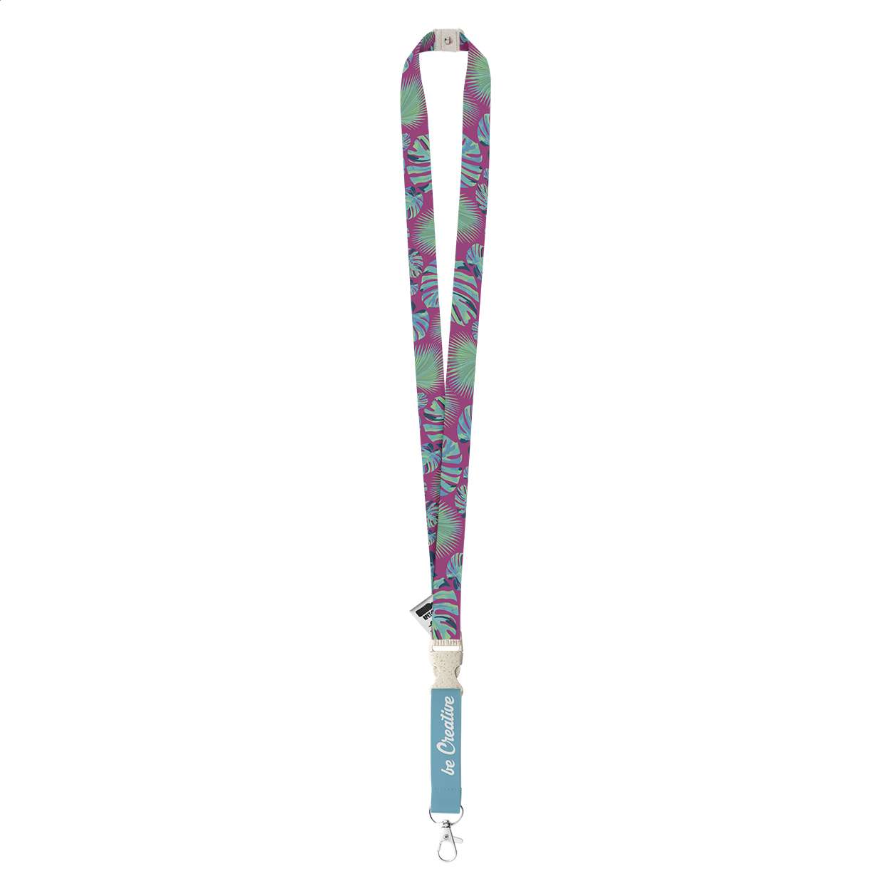 Lanyard in RPET con moschettone in metallo e fibbia di sicurezza in plastica di paglia di grano sganciabile. Con grafica stampata in sublimazione su entrambi i lati. MOQ: 100 pz.