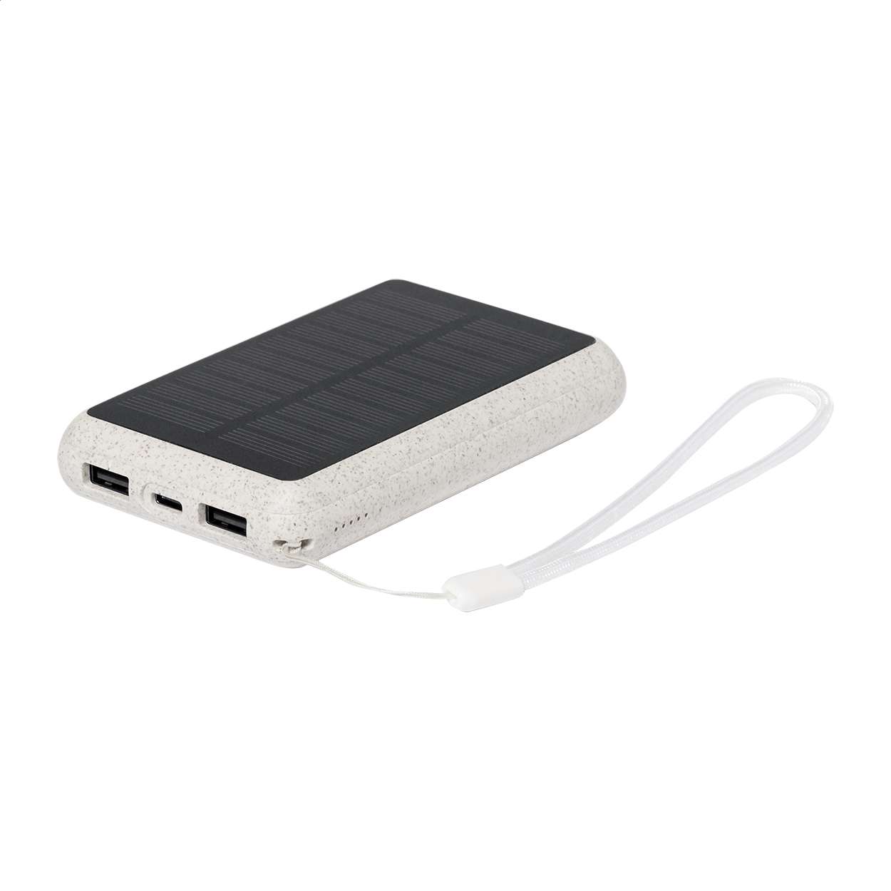 Power bank USB in plastica ecologica di paglia di grano con caricabatterie solare integrato e batteria da 5000 mAh. Con 2 porte USB e 1 porta USB-C per caricabatterie. Porta di ingresso USB-C.