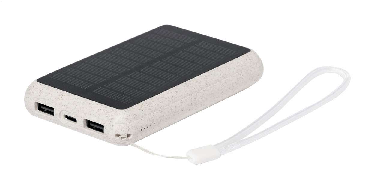 Power bank USB in plastica ecologica di paglia di grano con caricabatterie solare integrato e batteria da 5000 mAh. Con 2 porte USB e 1 porta USB-C per caricabatterie. Porta di ingresso USB-C.
