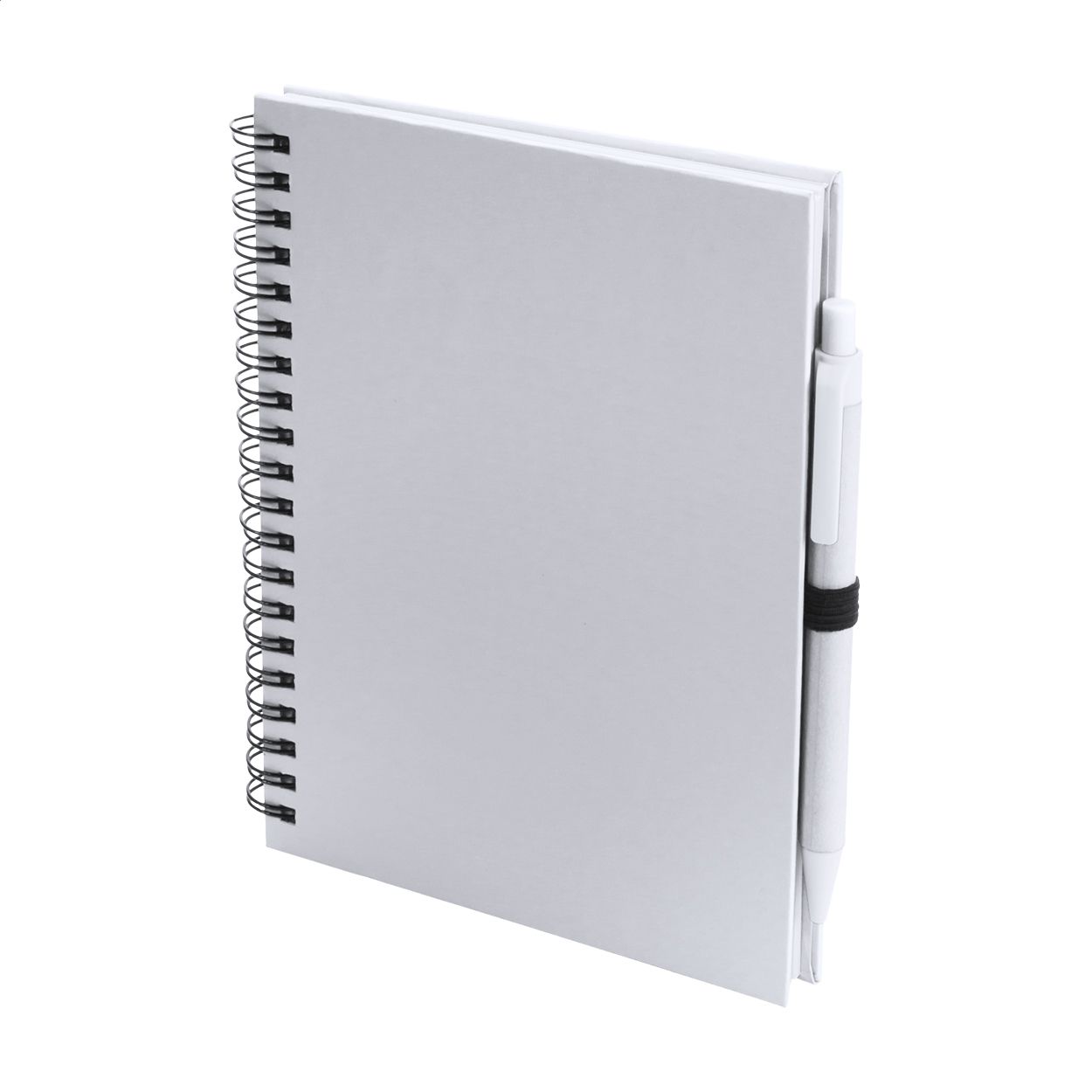 Quaderno formato A5 con copertina in cartoncino bianco e 100 fogli bianchi, costa del quaderno e cinturino in gomma in colore coordinato.