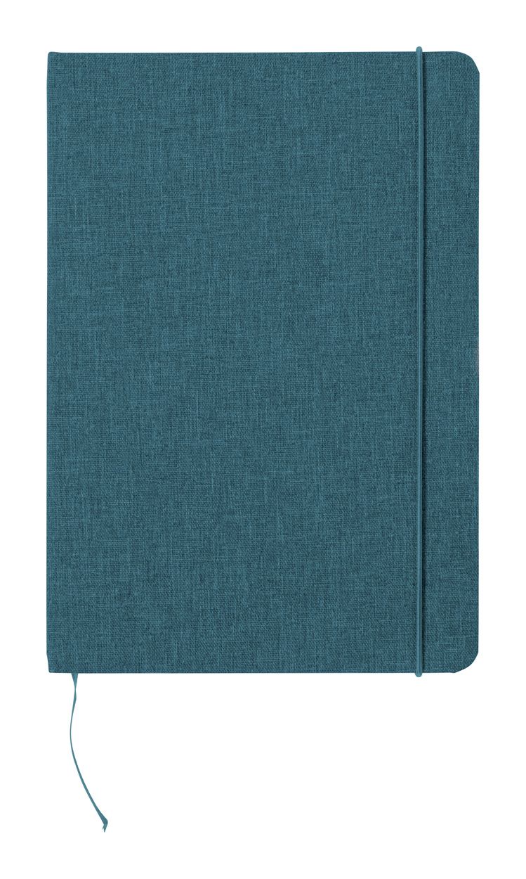 Quaderno formato A5 con 80 pagine bianche, copertina in poliestere 300D RPET, elastico colorato, segnalibro e porta penna.
