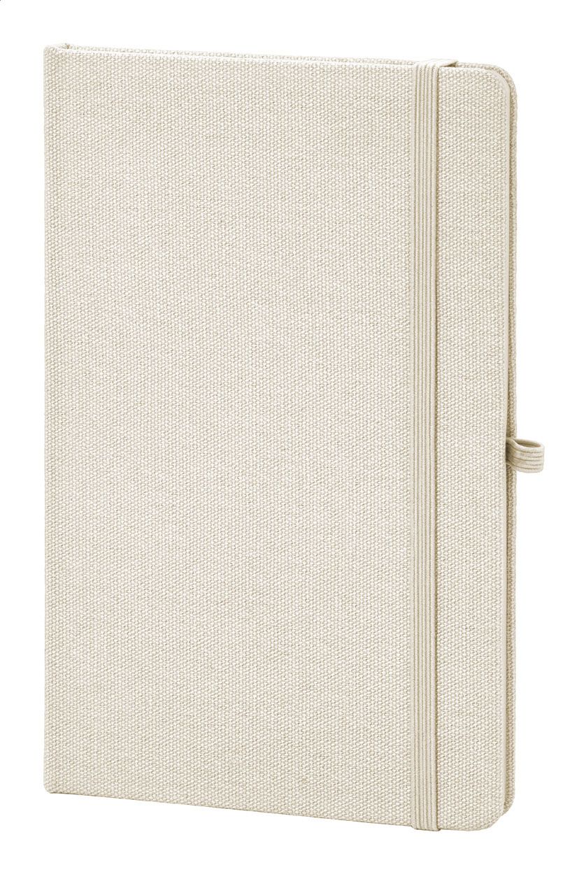 Quaderno con copertina in cotone riciclato da 80 fogli in carta riciclata a righe. Segnalibro in colore coordinato, elastico e portapenne. Formato A5.