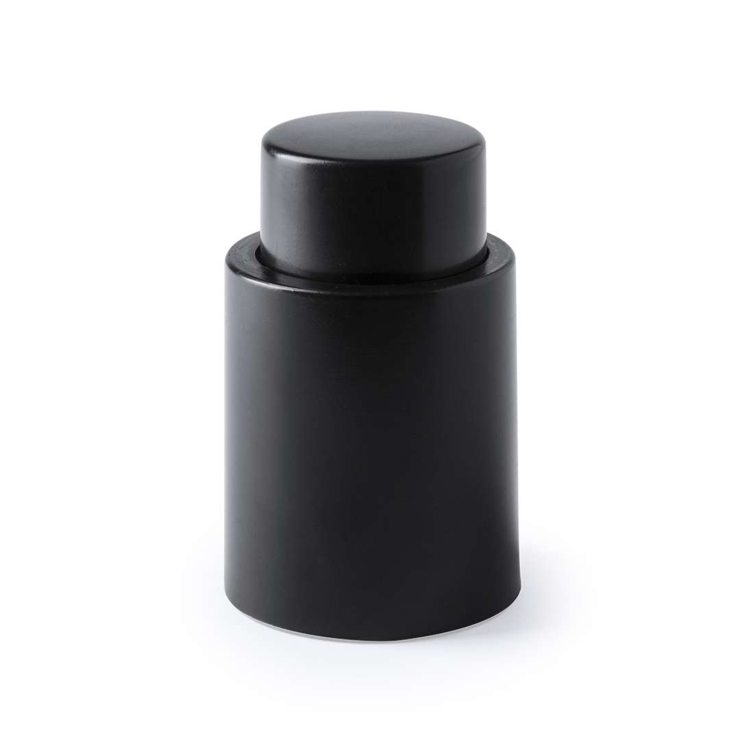 Tappo a pompa per vuoto per bottiglie di vino dall'elegante design nero. Parte superiore del tappo per la tampografia. Presentato in scatola individuale.