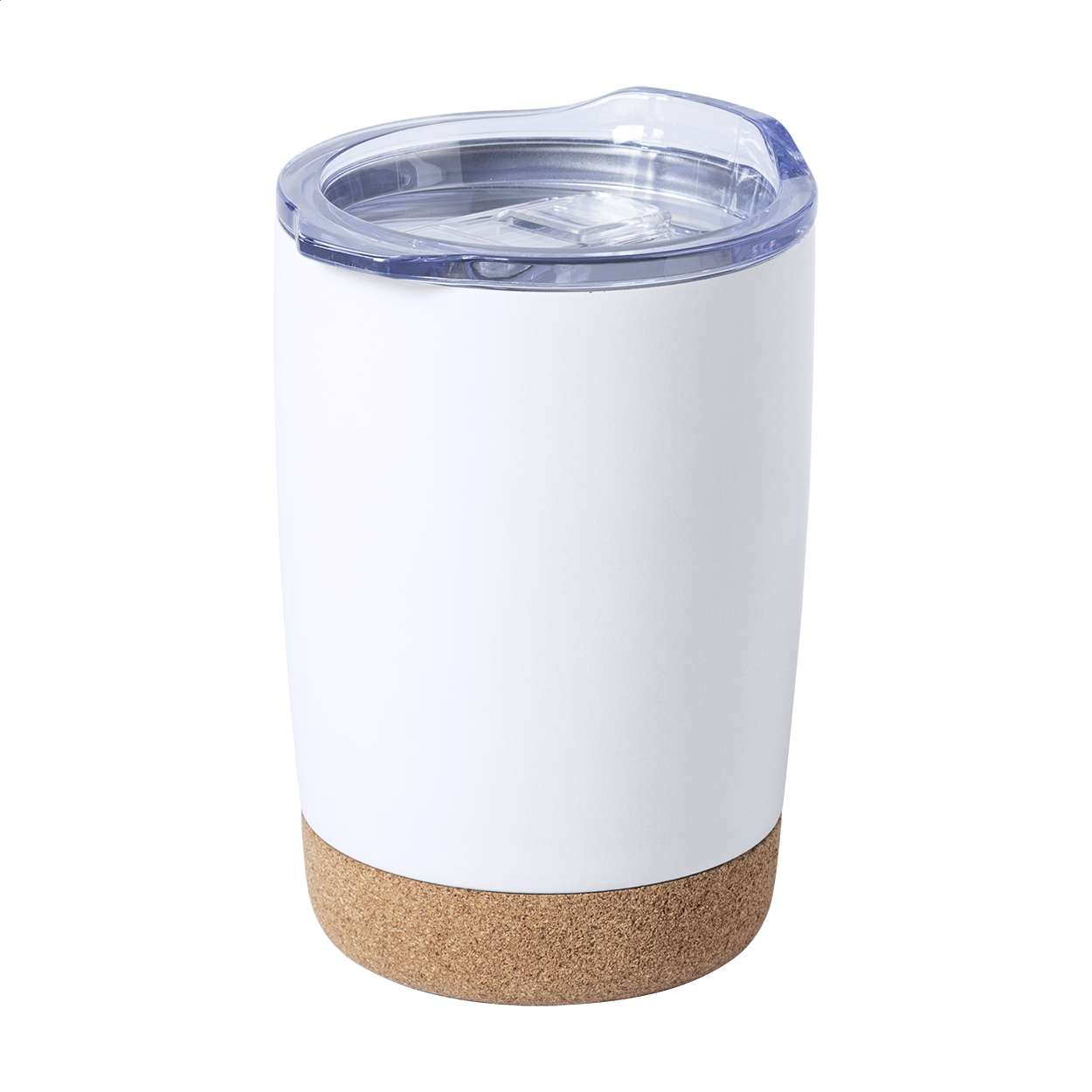 Bicchiere termico da 380ml. in acciaio a doppia parete con tappo erogatore in plastica trasparente, base in sughero e confezione regalo.