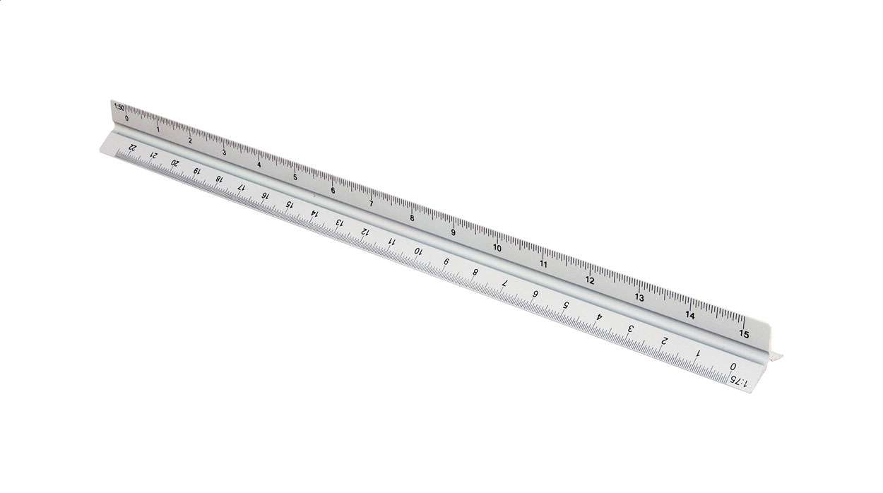 Scalimetro in alluminio a forma triangolare. Con righello da 30 cm e scala 1:20/1:25/1:50/1:75/1:100