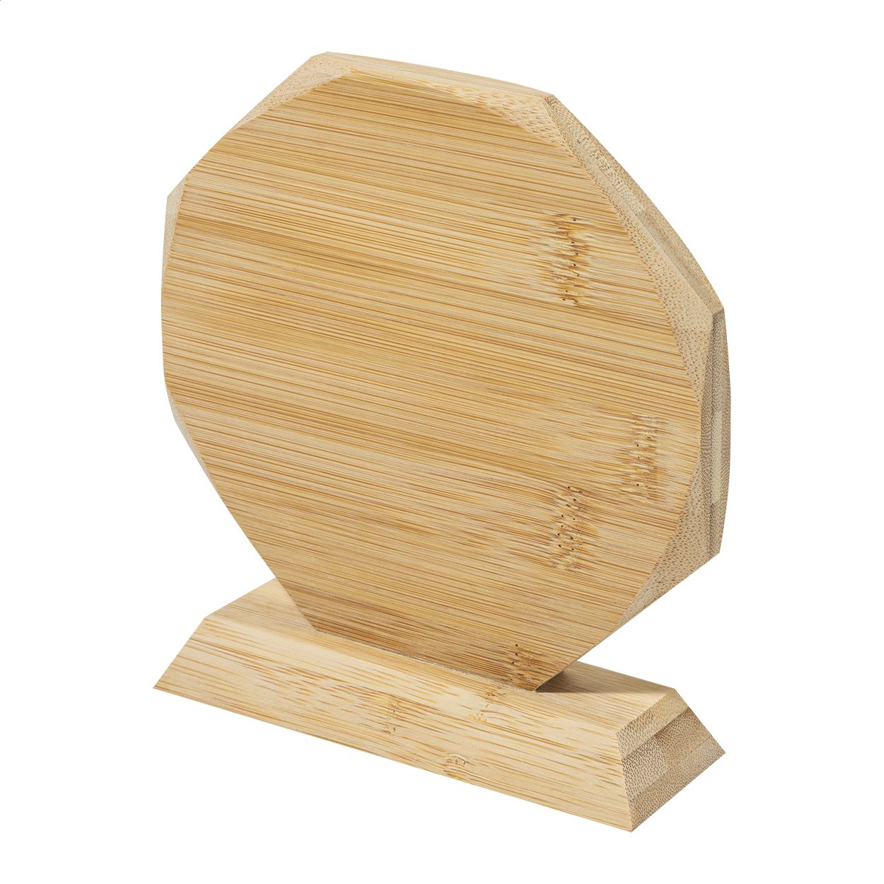 Trofeo ottagonale in bambù, confezionato in scatola regalo di cartoncino kraft.
