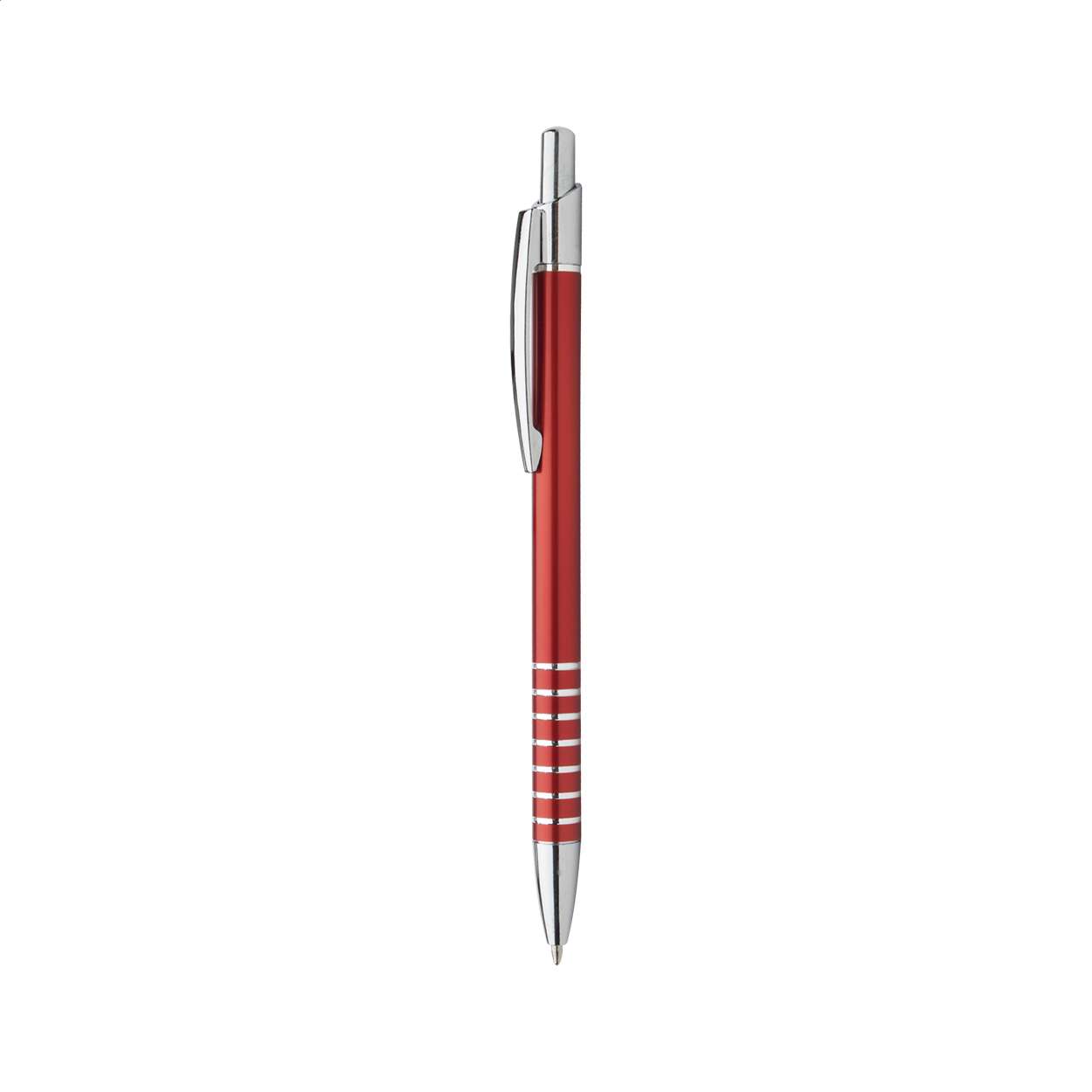 Penna a sfera in alluminio con decorazione incisa ad anelli, clip e puntale cromati, refill blu.