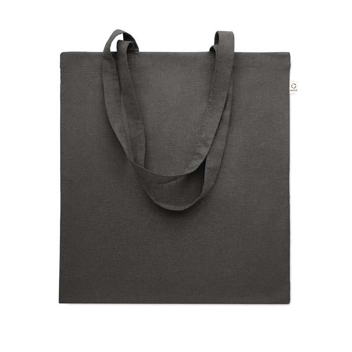 Shopper in cotone riciclato post-consumo (70% cotone riciclato e 30% RPET) con manici lunghi. 140 gr/m². Questo articolo può restringersi dopo la stampa.
