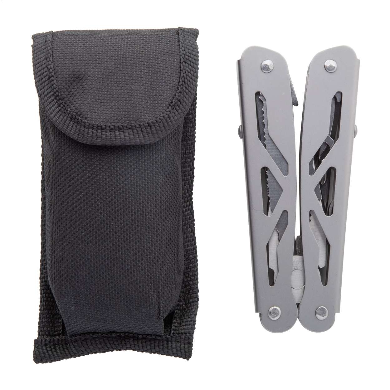 Multi utensile in acciaio inox con 9 funzioni ed astuccio di poliestere.