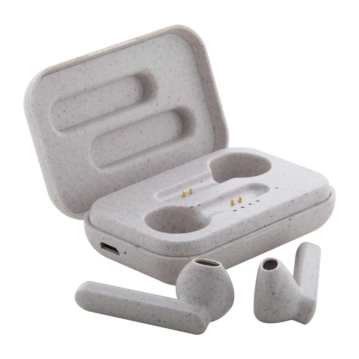 Auricolari stereo true wireless (TWS) in plastica ecologica di paglia di grano, con funzione di chiamata in vivavoce e custodia per il caricabatterie. Incluso cavo di ricarica USB. In scatola di carta kraft.